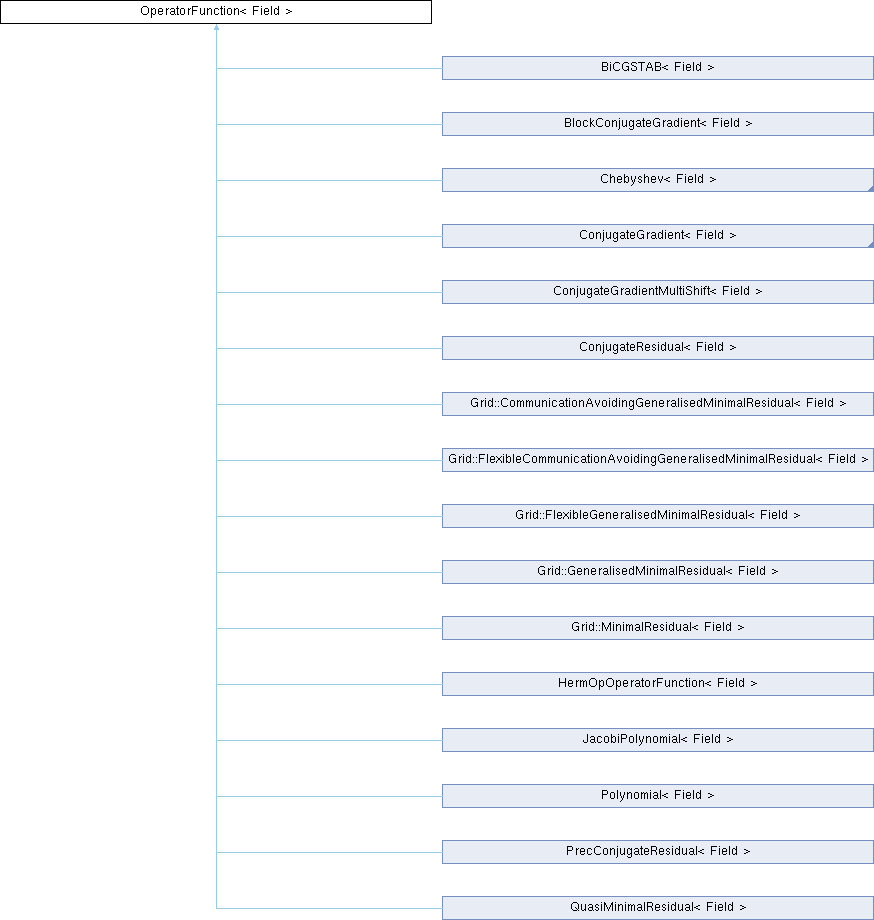 Implemented in BiCGSTAB< Field >, BlockConjugateGradient< Field >, Chebyshev< Field >, ChebyshevLanczos< Field >, ConjugateGradient< Field >, ConjugateGradient< Vi >, ConjugateGradientMultiShift< Field >, ConjugateGradientMultiShiftMixedPrec< FieldD, FieldF, type, type >, ConjugateGradientMultiShiftMixedPrecCleanup< FieldD, FieldF, type, type >, ConjugateResidual< Field >, Grid::CommunicationAvoidingGeneralisedMinimalResidual< Field >, Grid::FlexibleCommunicationAvoidingGeneralisedMinimalResidual< Field >, Grid::FlexibleGeneralisedMinimalResidual< Field >, Grid::GeneralisedMinimalResidual< Field >, Grid::MinimalResidual< Field >, Grid::MixedPrecisionFlexibleGeneralisedMinimalResidual< FieldD, FieldF, type, type >, HermOpOperatorFunction< Field >, JacobiPolynomial< Field >, Polynomial< Field >, PrecConjugateResidual< Field >, and QuasiMinimalResidual< Field >.